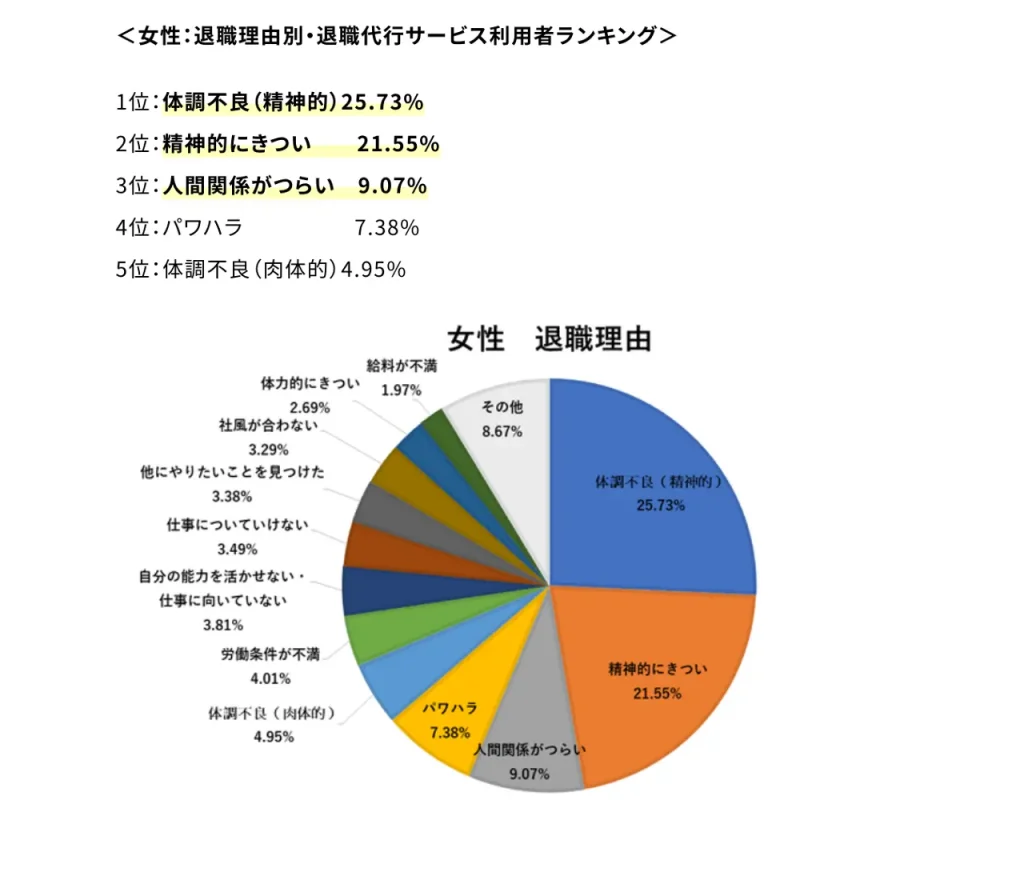 退職代行サービスを利用する人の多くは体調不良です。女性に特化した退職代行サービス「わたしNEXT」の調査では、女性の退職理由の1位は「精神的な体調不良」が25.75%、2位が「精神的にきつい」21.55%と精神的ストレスで47.3%が退職しています。